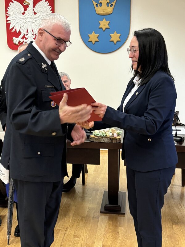 W sali sesyjnej obecni byli wszyscy prezesi i naczelnicy gminnych jednostek OSP oraz strażacy, którzy po Walnych Zebraniach, jakie odbyły się w pierwszym kwartale roku 2026 zakończyli swoje kadencje. Wójt Gminy i Przewodnicząca Rady Gminy wraz z obecnym na sesji Wiceprezesem Powiatowego Zarządu OSP Grzegorzem Nogłym podziękowali za służbę ustępującym strażakom i gratulowali nowo wybranym oraz tym, którzy zostali wybrani do pełnienia funkcji prezesów i naczelników na kolejną kadencję.