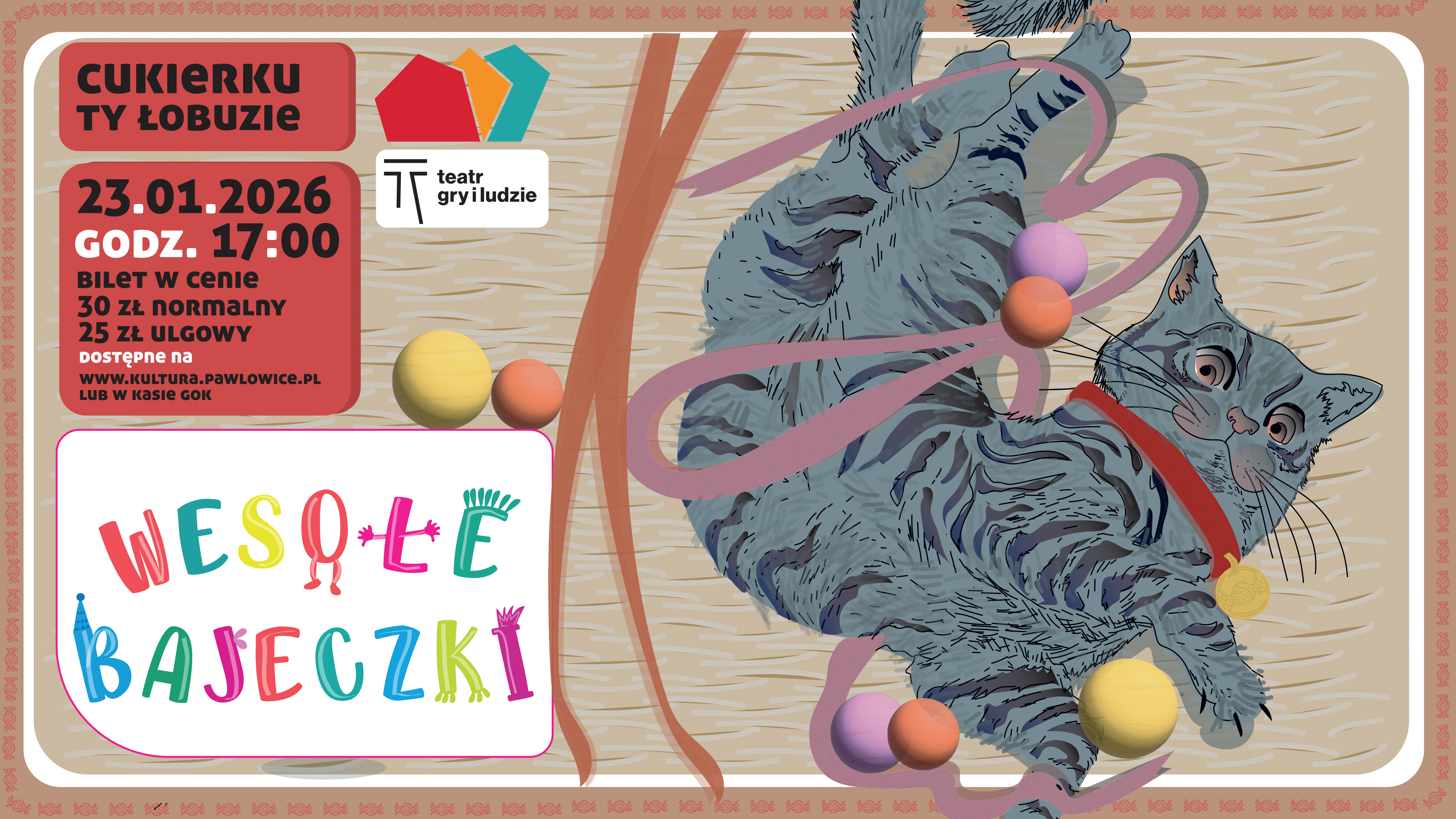„Cukierku, ty łobuzie!” to żywy, barwny i zabawny spektakl dla młodszej widowni na podstawie lektury szkolnej, opowiadający o bardzo ważnej dla dziecka przyjaźni z czworonogiem. Uczy empatii wobec zwierząt i odpowiedzialności