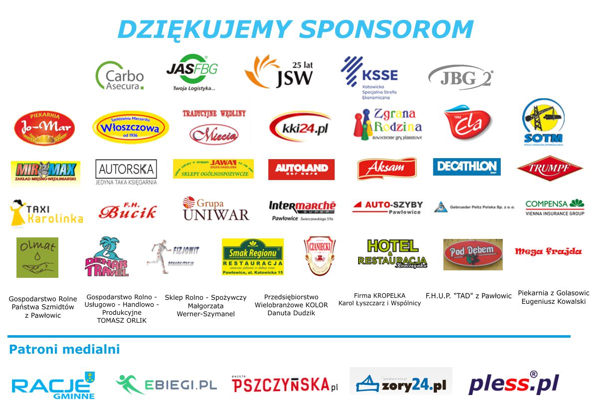 Medale i nagrody wręczali: wójt gminy Pawłowice Franciszek Dziendziel, Aleksander Szymura – przewodniczący Rady Gminy Pawłowice oraz Jarosław Domin – prezes firmy JAS -FBG S.A. – która po raz trzeci była sponsorem głównym biegu i Artur Dyczko – Zastępca Prezesa Zarządu ds. Strategii i Rozwoju JSW, która również była głównym sponsorem wydarzenia. Nieco ponad setka zawodników jeszcze przed zawodami wzięła udział w konkursie na hasło promujące bieg w 2019 r. Wygrała go Celina Burczyk z Katowic hasłem "Biegaj z nami w Pawłowicach, zobacz radość na ulicach!" i wróciła do domu z profesjonalnym zegarkiem sportowym firmy Garmin. Tuż przed rozdaniem nagród, wójt gminy Franciszek Dziendziel wręczył specjalne wyróżnienie Bożenie Wróbel - dyrektorce Gminnego Ośrodka Sportu, która otrzymała brązową odznakę Za Zasługi dla Sportu przyznaną przez Ministra Sportu i Turystyki. Bożena Wróbel od 36 lat pracuje w gminie Pawłowice, najpierw jako nauczycielka wychowania fizycznego, a od piętnastu lat – dyrektorka jednostki zajmującej się upowszechnianiem i rozwojem sportu w gminie. Organizacja biegu nie byłaby możliwa bez pomocy sponsorów, którzy hojnie wsparli wydarzenie i wolontariuszy: pracowników szkoły podstawowej z Pielgrzymowic, strażaków z wszystkich gminnych jednostek OSP, którzy zabezpieczali trasę biegu, harcerzy z Pawłowickiego Szczepu ZHP rozdających na trasie wodę dla zawodników i służących wszelką pomocą. W sumie przy organizacji biegu pracowało ok. 100 osób. Nie sposób nie wspomnieć o mieszkańcach, którzy kibicowali zawodnikom na trasie i zagrzewali do boju muzyką puszczaną przez otworzone na oścież okna. Wszystkim im serdecznie dziękujemy.