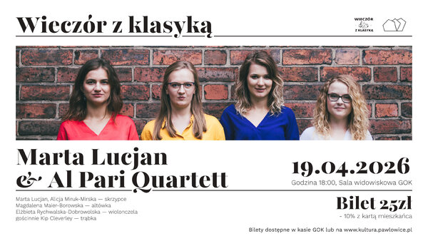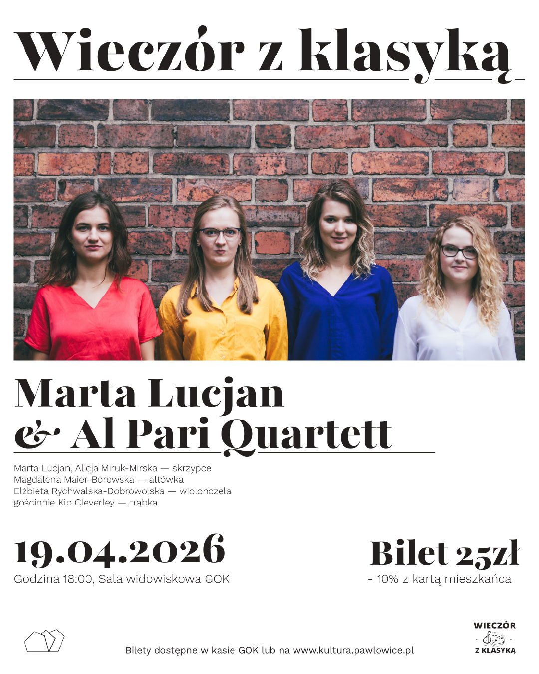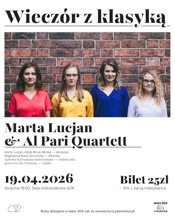 Zapraszamy na kwietniowy koncert z cyklu "Wieczór z klasyką". Przed Państwem wstąpi Marta Lucjan oraz kwartet Al Pari...