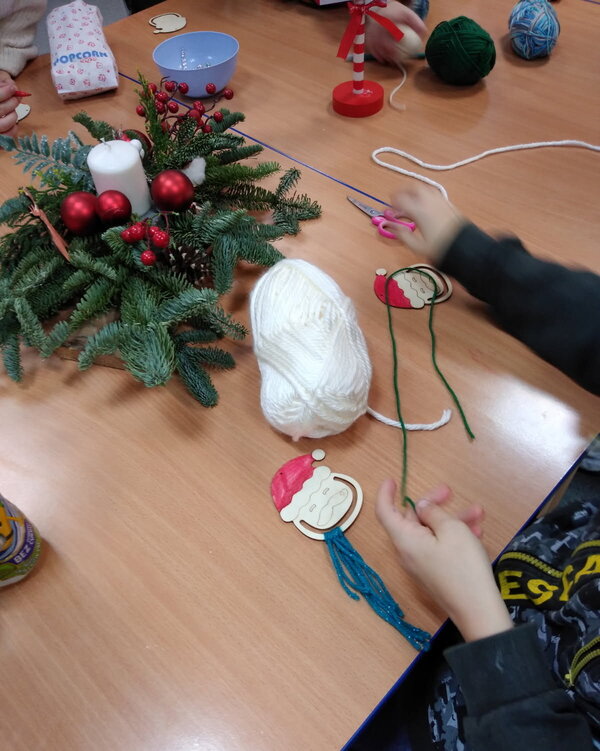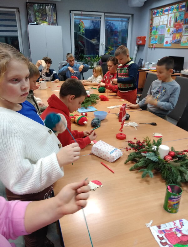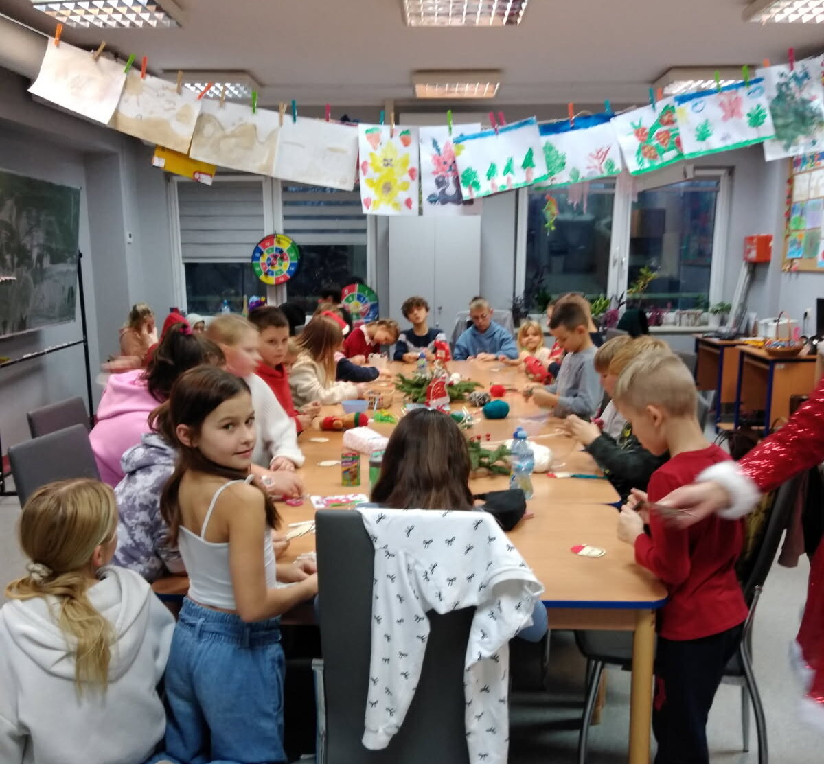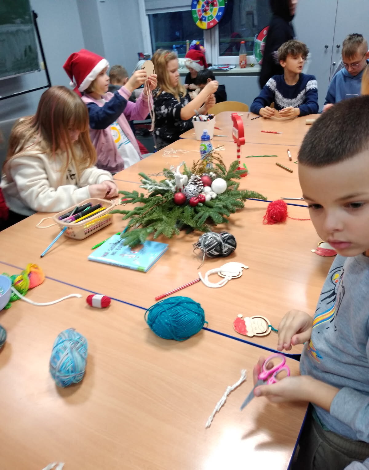 Dzieci z zapałem tworzyły piękne ozdoby mikołajkowe. Aby umilić sobie czas oczekiwania odbył się quiz wiedzy o Mikołaju oraz zabawa z bańkami dymnymi.