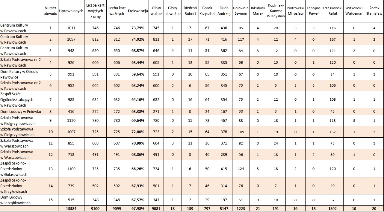 Frekwencja w I turze wyborów prezydenckich wyniosła w gminie Pawłowice 67,98%. Rekordowa była w obwodzie nr 2 (Centrum Kultury Pawłowice), gdzie głosy oddało 74,02 % osób uprawnionych. Największe poparcie spośród kandydatów uzyskał urzędujący prezydent Andrzej Duda (5147 głosów), na drugim miejscu znalazł się Rafał Trzaskowski z 1502 głosami, a na trzecim Szymon Hołownia, który zdobył 1223 głosy.