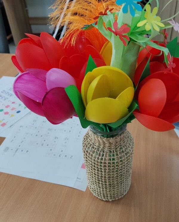 Dnia 5 marca dzieci ze świetlicy Różowe Okulary powitały już wiosnę, choć do kalendarzowej wiosny zostało jeszcze kilka tygodni. Na świetlicy pojawiły się piękne tulipany z... plastykowych łyżek. Mimo trudności w wykonaniu dzieciom spodobał się efekt.