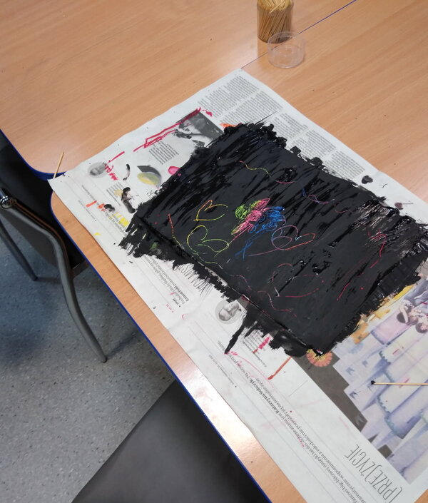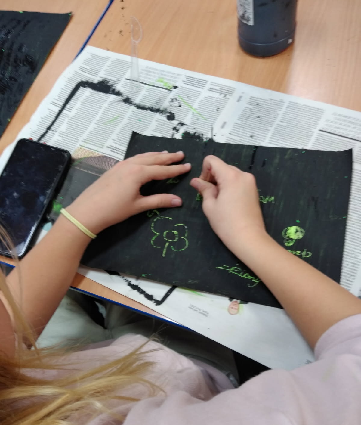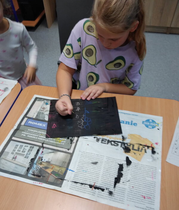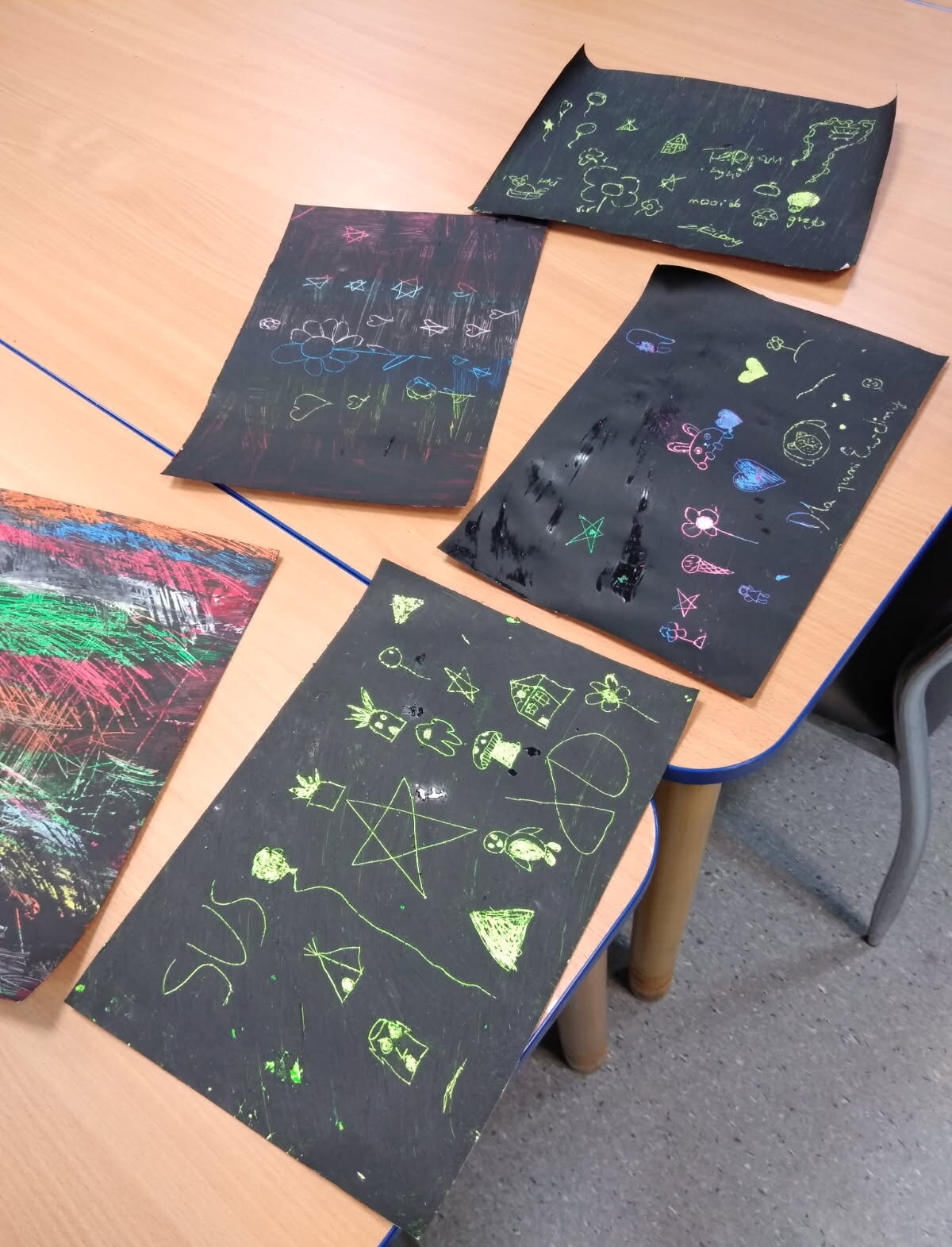 Dnia 16 października na świetlicy Różowe Okulary odbyły się zajęcia plastyczne. Tematem przewodnim była wydrapywanka, technika polegająca na zdrapaniu wierzchniej warstwy farby, by odsłonić to, co jest pod spodem. W ten sposób powstały ładne i ciekawe rysunki.