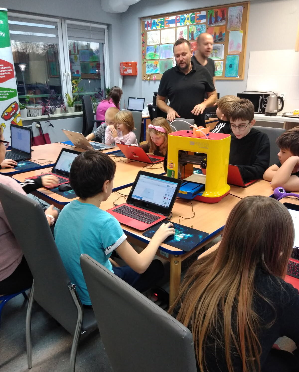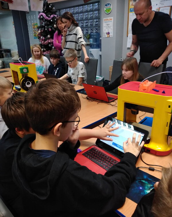Jednym z głównych punktów warsztatów było tworzenie własnych breloków z imionami na drukarce 3D. Dzieci samodzielnie projektowały kształty i litery, a następnie obserwowały, jak ich pomysły zamieniają się w rzeczywiste przedmioty.