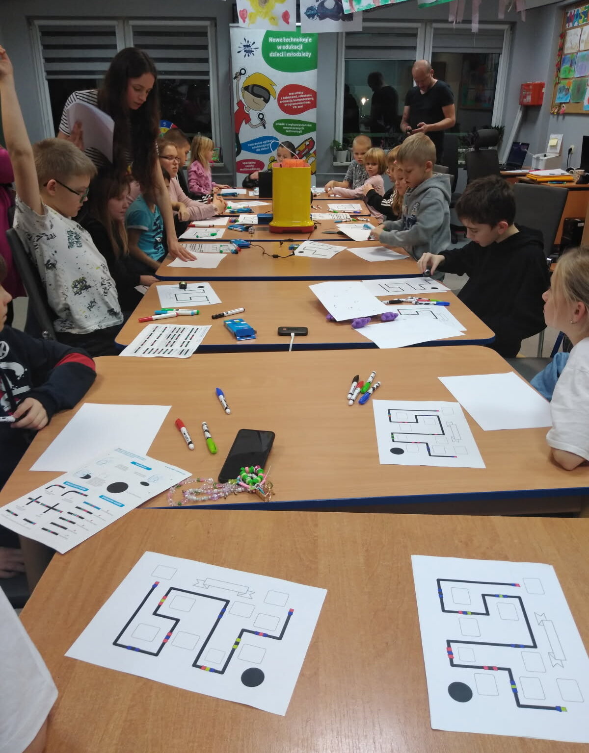 Kolejnym etapem warsztatów było programowanie robota, który poruszał się po przygotowanej ścieżce. To zadanie rozwijało umiejętności logicznego myślenia, planowania oraz podstawy programowania w praktyce.